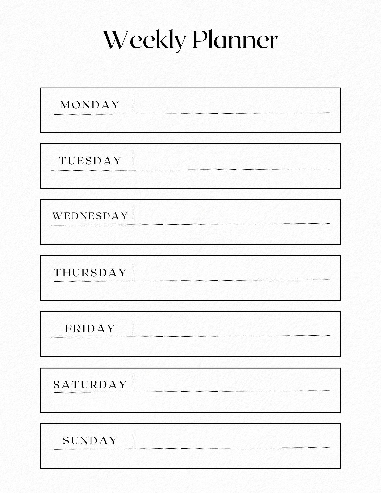 Stay on top of your schedule with this sleek and simple Weekly Organizer. Designed for creatives, students, and professionals alike, this planner helps you map out your week with intention and clarity. With space for daily priorities, to-do lists, and notes, it’s perfect for managing tasks, setting goals, and boosting productivity - one week at a time. Whether you're planning meetings, content, or self-care, this organizer keeps everything in one place so you can stay focused and feel in control.